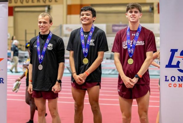 West Texas A&M’s Adrian Legarreta and Emeka Nmesirionye found themselves on top of the podium on Friday during the opening day of the 2026 Lone Star Conference Indoor Track & Field Championships at the Albuquerque Convention Center.